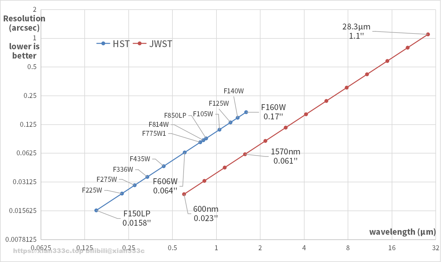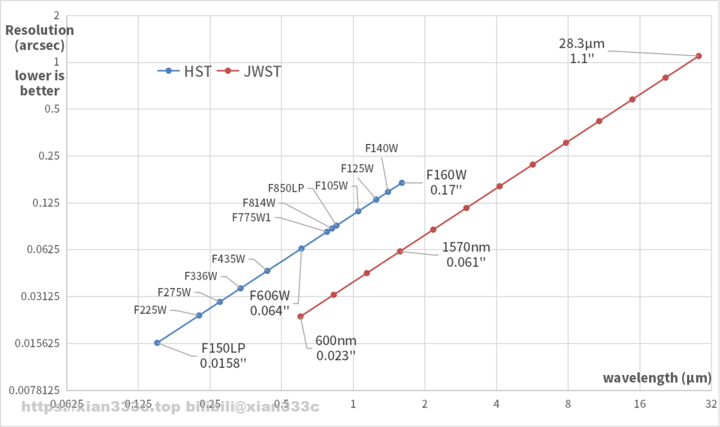 虽然鸽王的口径更大,但是就如同他金色的镜面一样,JWST本身就工作在长波长,所以在角分辨率上总体上反而不如HST。两者之间唯一的交集在经典的Hα波长和NIR波长,在这里JWST能够比HST分辨率更高。