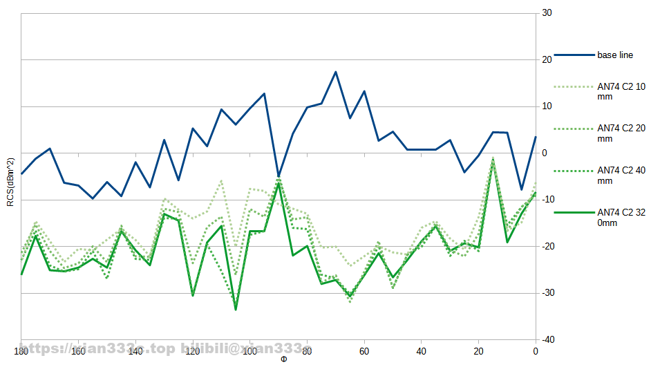 再把材料自身压到极限下,类J36设计可以达到-20到-30dBm^2的散射截面积。在这里这个吸波效果被应用到了整个表面,实际使用中会和这有点差距。