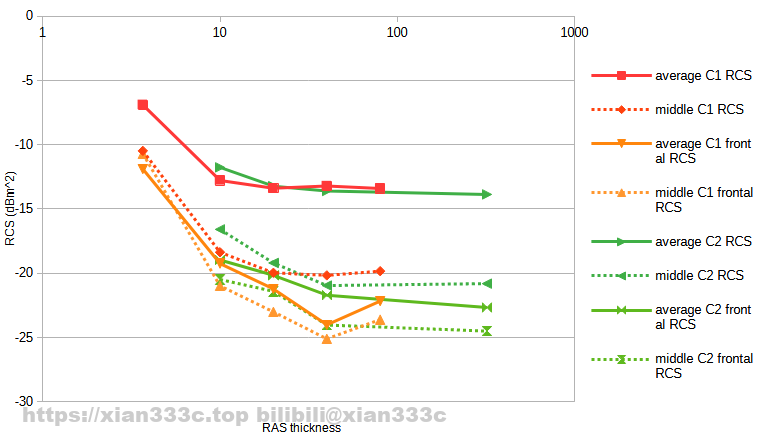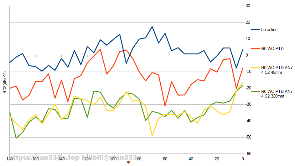 图上就是我把数字大小做小了。类似的原因有一些人做比如J20的模型会得到很不同的结果。通常隐身飞机在PEC表面没有吸波下,通常会略高于-10dBm^2的散射截面积,这不是因为设计问题,大多是进气道本身会把反射引导到发动机上产生影响。但是比如这个文章得到低的多的值,在正面的不少方向能得到-40dBm^2。