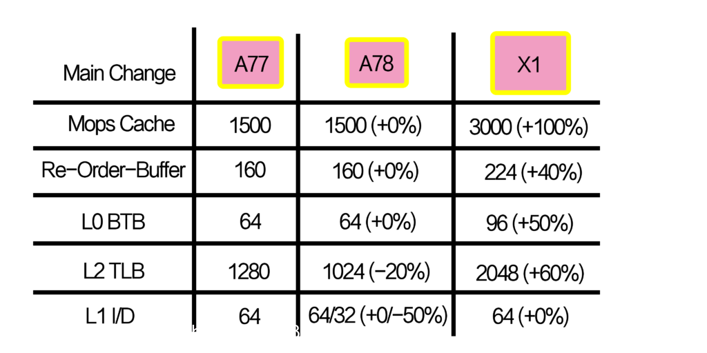 X1依旧保留了仅可配置64KiB的一级缓存的传统艺能。Mops缓存的带宽从6个Mops每周期增加到8个。其余还是A78一样。