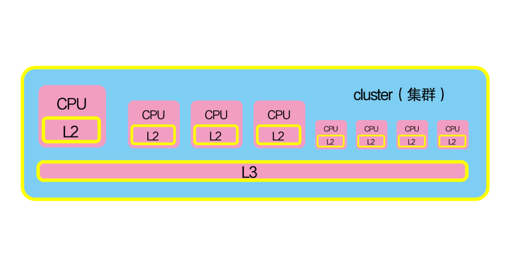 首先是big.LITTLE下的大小核。在 big.LITTLE 下,我们可以将相同的最多4个CPU组成一个集群,共享同一片二级缓存,再将这些集群互联。但是在big.LITTLE下,我们不可以使用太多的集群,比如说联发科的3丛簇。