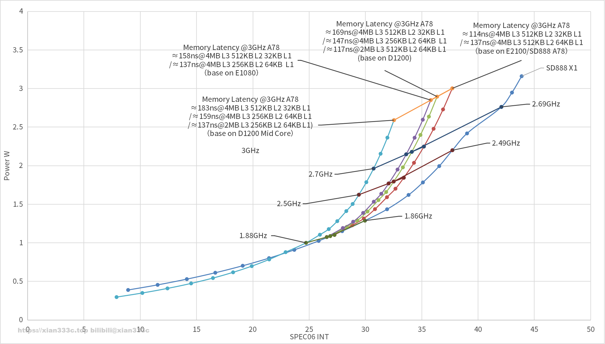 可以看到缓存配置的差距主要体现在高频部分上,随着频率增加这个差距就越明显。而在低频率低性能区间,实际上砍了缓存的配置的能耗比更高,功耗更低。